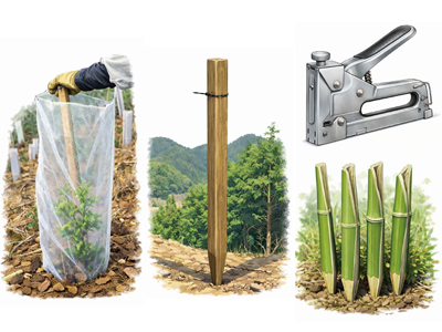 ※幼木保護ネットと木製支柱の固定はタッカーを使用します。